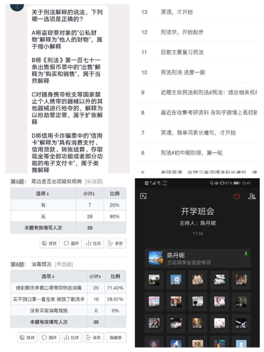 辅导员队伍于2月29日、3月1日召开线上主题班会,进行收心教育和学风动员,为学校在线教学进行“暖课”。各班级利用QQ、企业微信等平台对同学们当前的学习情况进行问卷调研,组织学习互助小组,督促同学们每天在线学习打卡,为家中备战法考资料不足的同学共享线上资料,并进行线上讨论和指导。同时,加强学生的心理辅导和心理建设工作,提醒同学们学习和防疫两不误,强调学习上有问题联系老师,生活上有需要找学院,帮助同学们解决困难。