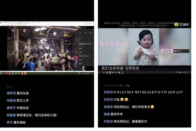活动以全体团员起立齐唱团歌拉开序幕,李自维书记通过视频为大家加油鼓劲,鼓励同学们肩负起青年团员的使命与责任,不忘初心、牢记使命,服从安排,积极应对,主动发挥共青团员的先锋模范作用,协助学校、学院做好疫情防控工作。一段重庆防疫宣传片为大家带来了别样的感动,团员们纷纷在评论区留言,为重庆加油,为武汉加油,为中国加油。