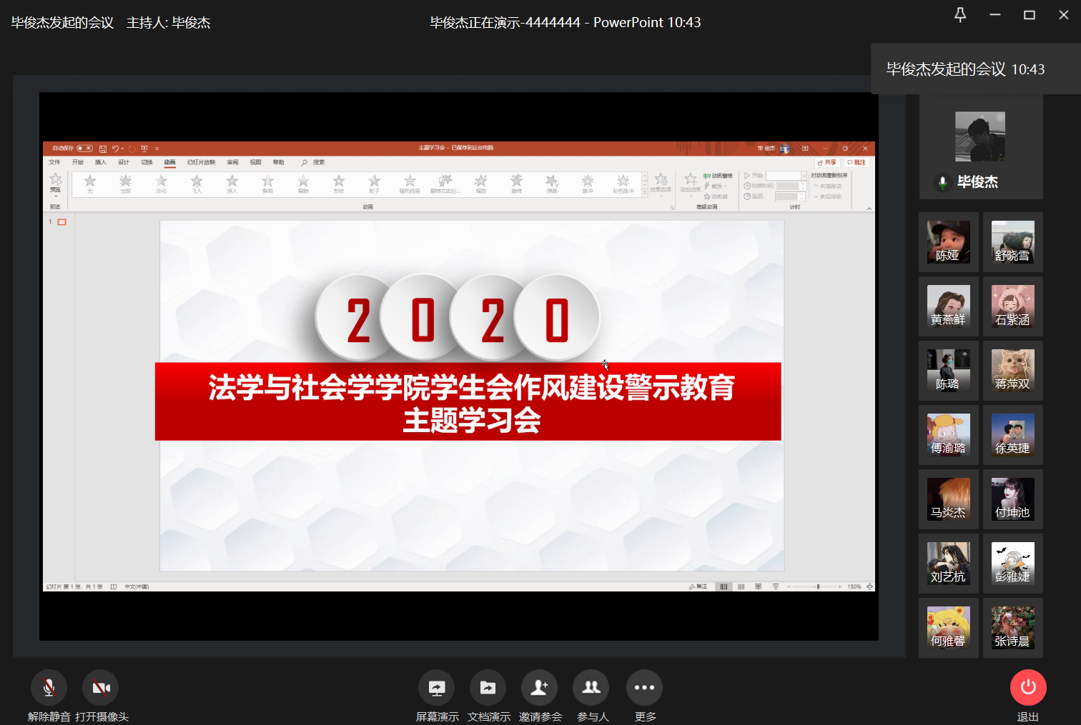 为认真贯彻落实全国学联二十七大精神,进一步推动全国高校学生会(研究生会)深化改革,落实好共青团和学联组织指导管理责任,坚持从严治会,展现清新阳光、积极向上的学生会组织形象,ok138cn太阳集团于2020年11月25日12:00在线上开展学生会作风建设警示教育主题学习会。会议由学院分团委(学生)副书记毕俊杰同学主持。
