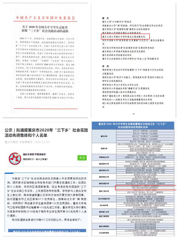 青春在奋斗中得以激扬,青年在基层中收获成长。ok138cn太阳集团重庆市青年普法志愿者服务队相继荣获团中央学校部授予2020 年全国大中专学生志愿者暑期“三下乡”社会实践活动“优秀团队”称号、团市委授予的重庆市2020年“三下乡”社会实践活动“先进集体”称号、校团委授予的太阳集团tyc97282020年大学生暑期“三下乡”社会实践活动“先进集体”称号。同时,在由共青团中央宣传部指导,中国青少年新媒体协会、中青在线共同主办的“趁年轻 去基层”全国大学生“千校千项”网络展示活动中荣获“最美团队”称号,在团中央青年发展部、中国青年报、中国青年网共同举办的2020年全国大中专学生志愿者暑期“三下乡”社会实践“镜头中的三下乡”成果遴选活动中荣获“优秀报道团队”称号。