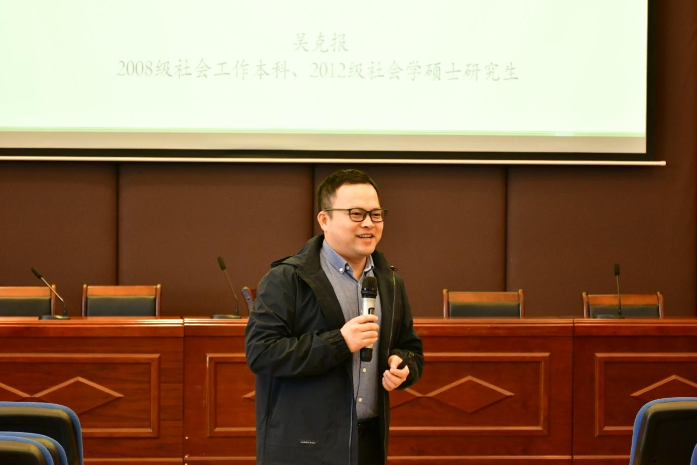 吴克报曾是我校2008级社会工作专业本科生、2012级社会学专业硕士研究生,他以“微力量”凝聚“大能量”为题,结合自身学习与工作经验与学弟学妹展开交流。“但行好事,莫问前程”,这是吴克报自身的座右铭,也是给学弟学妹的建议。大学是从学生到社会化最好的蜕变时期,他鼓励大家从小事做起,哪怕是小到用订书机装订文件都是宝贵的工作经验,不断积少成多,才可以在未来的就业中增加竞争优势。同时,他希望同学们在未来就业方向的选择上不要妄自菲薄,把握住社会工作者就是社会的医生的这一重要角色,在社会工作的利他主义和利益至上的冲突下能够坚定自己的职业理想。