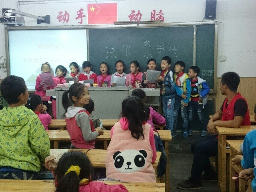 滨江小学位于重庆市江北区,有学生五百多人,其中进城务工子女占学生总人数的95%。义协成员给同学们讲解了法律的定义,并提出了身边的许多违法行为,给同学们普及了法律的基础知识。在活动过程中,义协成员采取有奖竞答、分发礼品的方式,让同学们十分主动积极地参与到法律课堂中。最后,义协成员围绕“知法更要守法”的主题,教同学们如何抵制身边的诱惑,如何避免触犯法律的底线。在场的同学们在轻松的氛围中学习到法律知识,也感受到法律的庄严神圣之处。