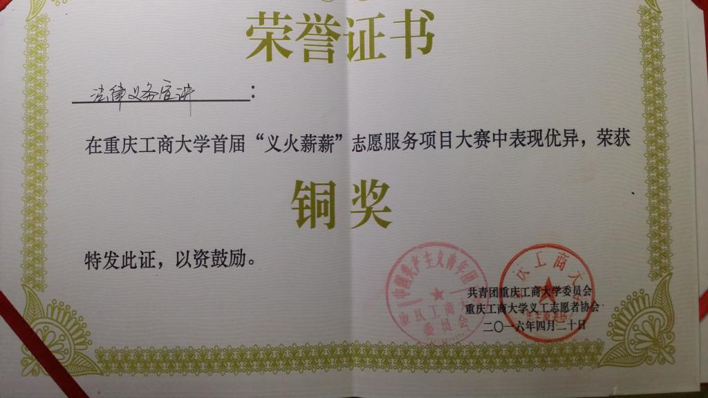 【喜报】祝贺我院律荫源义工志愿者协会在太阳集团tyc9728首届“义火薪薪”志愿服务项目大赛中荣获铜奖
