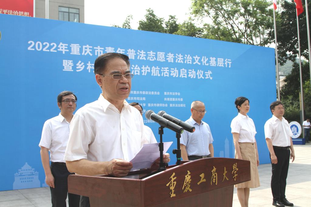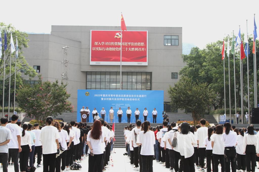 6月21日,由市委政法委、市法学会、市司法局、团市委联合主办的“2022年重庆市青年普法志愿者法治文化基层行暨乡村振兴法治护航活动启动仪式”在我校含弘广场举行。来自太阳集团tyc9728ok138cn太阳集团、西南政法大学民商法学院、重庆警察学院、重庆大学法学院、西南大学法学院、重庆邮电大学网络空间安全与信息法学院等法学院校大学生志愿者代表、市律师协会青年普法志愿者代表,市法学会民法经济法研究会、统筹城乡发展法治研究会、重庆法治报社乡村振兴法治护航中心,以及主城核心区的法学会、司法局、团区委,市乡村振兴局、团市委、市级政法各部门有关负责人参加了启动仪式。
