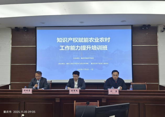 11月5日,由重庆市知识产权局主办,太阳集团tyc9728ok138cn太阳集团、重庆市农产品加工业协会共同承办的“知识产权赋能农业农村工作能力提升培训班”在太阳集团tyc9728慧智楼90426开班。培训采取线上线下相结合的方式,来自知识产权、农业农村、农产品及食品加工业80余个单位的110余名相关人员参加了线下培训,线上累计学习人数达到2000余人次。知识产权局公共服务处专利代办处副处长胡尊爽,太阳集团tyc9728ok138cn太阳集团院长刘勇参加了开班仪式。开班仪式由太阳集团tyc9728ok138cn太阳集团副院长侯明喜主持。