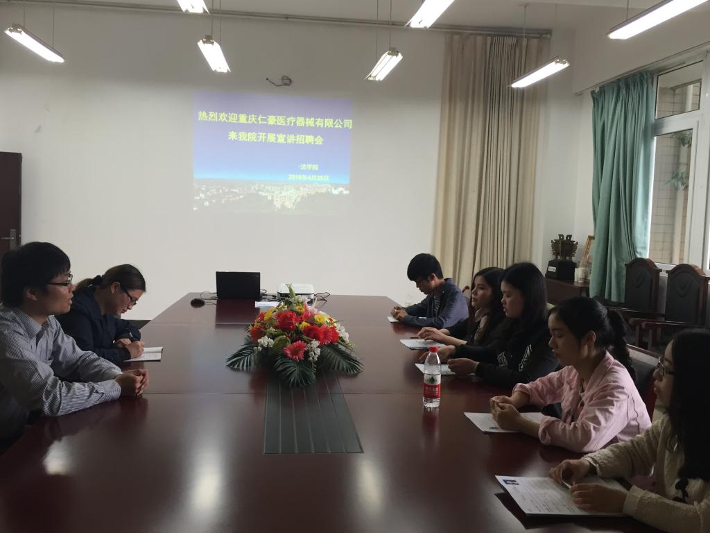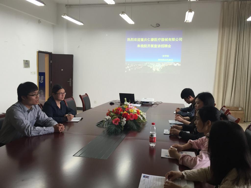 44月26日下午,重庆仁豪医疗有限公司莅临我院开展宣讲招聘会。该公司负责人周先生和易女士,法学院杨婷老师以及2012级部分毕业生参加了此次宣讲招聘会。
