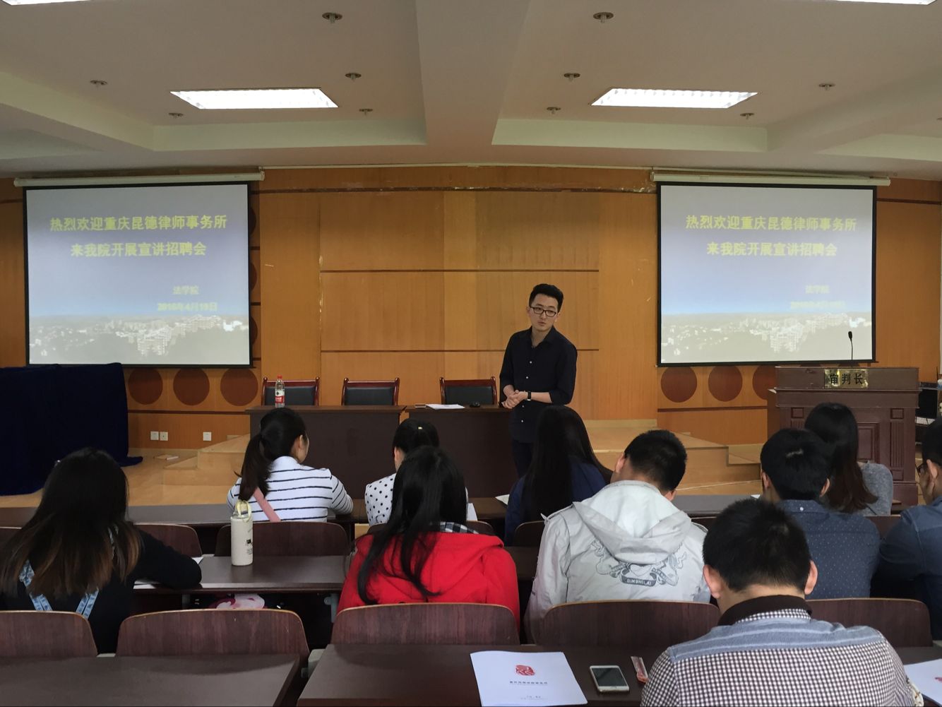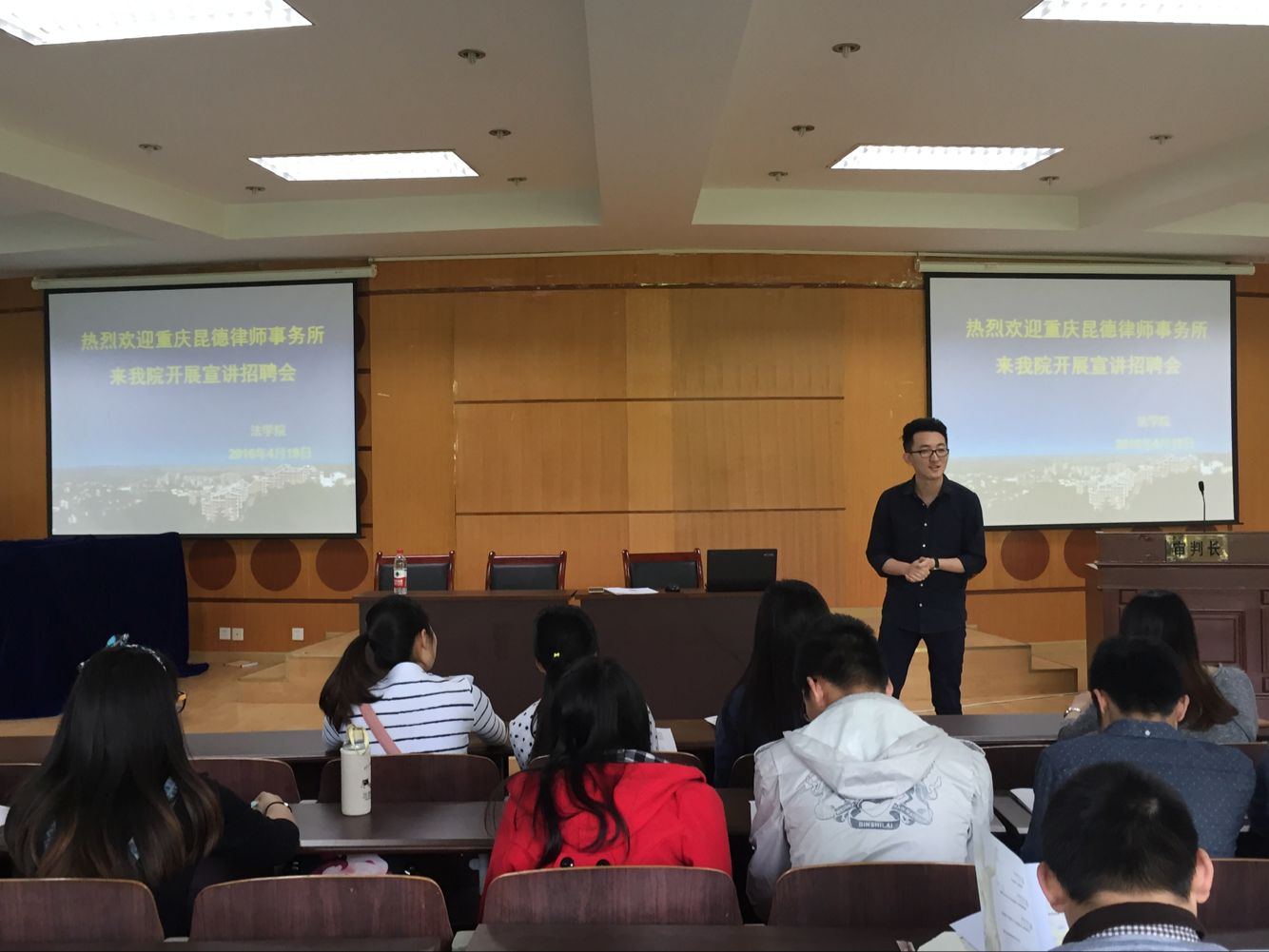 4月19日上午,重庆昆德律师事务所来我院开展宣讲招聘会。该所商务部杨主任(律师)、助理周女士以及学院杨婷老师和2016届部分毕业生参加了此次宣讲招聘会。